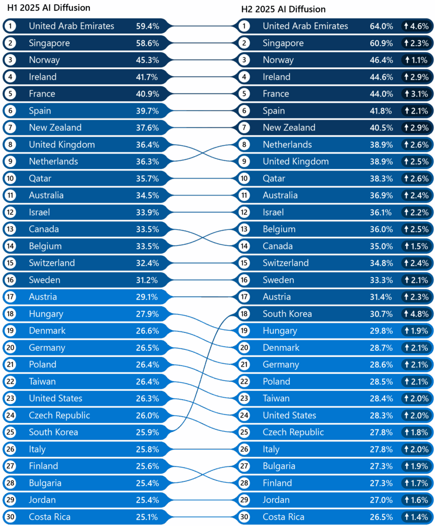 Esta diferencia amplía la distancia hasta los 10,6 puntos porcentuales, un dato que subraya el riesgo de que la IA refuerce desigualdades existentes si no se acompaña de políticas de acceso y formación. El informe apunta que la velocidad de adopción depende cada vez más de la capacidad de los países para crear ecosistemas digitales sólidos.